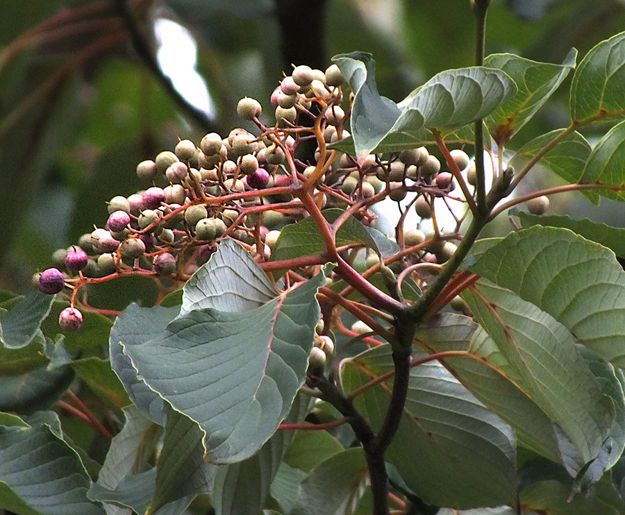 ♪ ミズキの実が色づいてきました。徐々に赤紫色になり、秋には黒く熟して、鳥の餌になります。