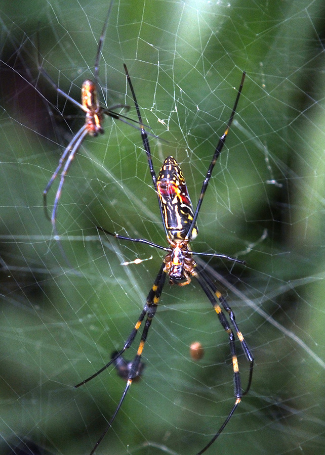 ♪ ジョロウグモが繁殖期に入りました。クモの巣の中に、オスとメスが一緒にいるのを、よく見かけるようになりました。中央の大きいのがメス、横にいる小さいのがオスです。